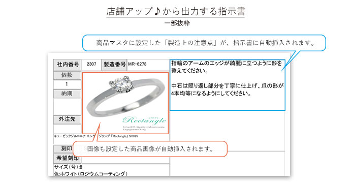弊社はご注文を頂いてからお客様にお届けするジュエリーを製作しているのですが、店舗アップで印刷した指示書に各商品ごとの製造上の注意点を表示できるところが気に入っています。